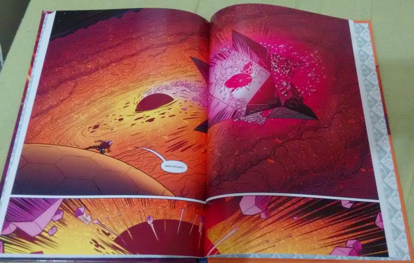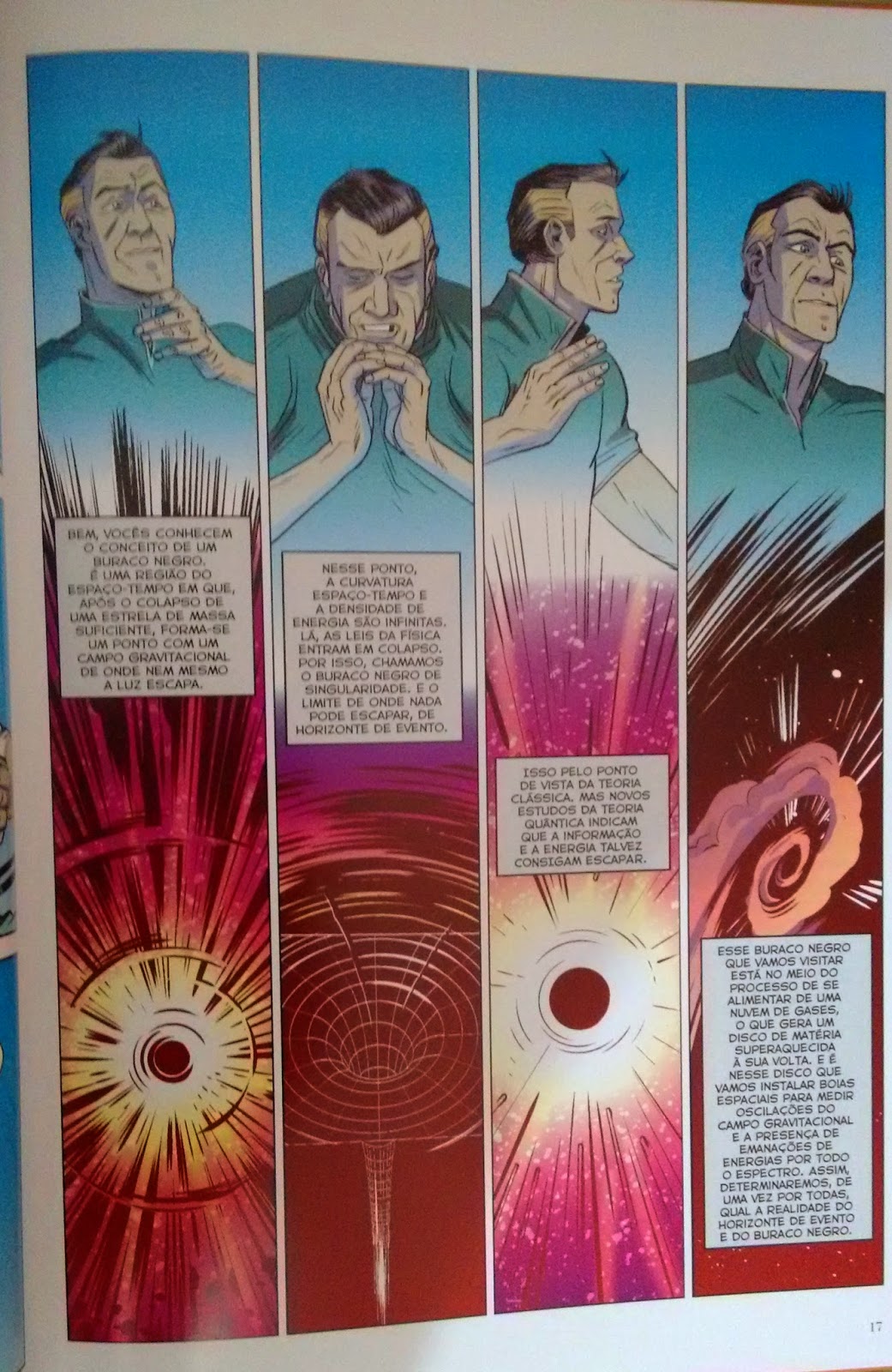 Mas antes predominam outras cores como o azul, nesse página podemos ver isso claramente, enquanto vemos a explicação sobre os buracos negros a página vai ficando divida entre as duas cores: